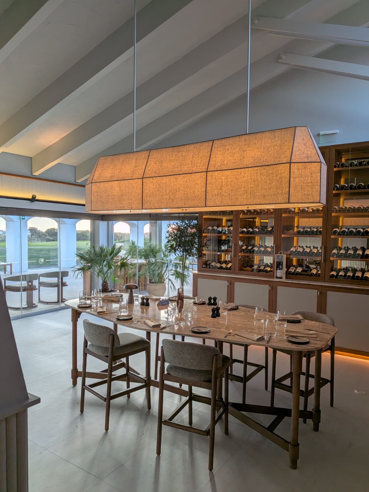 This striking piece serves as a stunning structural element for the bar of a luxury hotel in the Algarve. We create a large-scale, bespoke metal piece, fully covered with lampshade fabric. This fixture is suspended above the bar, where it seamlessly extends into the bottle and glass rack to form an integrated lighting system. See below how this unique project unfolded.